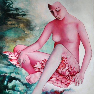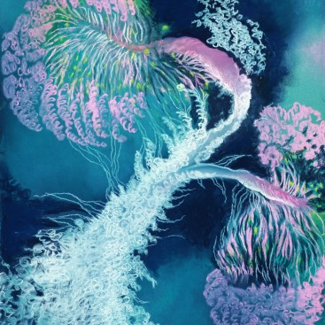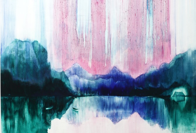 Faces borrowed from history of art float out from flat seas of colour, a world away from her mysterious landscapes, suspended above and below the horizon line that she discovered on moving to Marseille from Paris in 2012. Each is a journey of discovery where she invites the observer to cross over into her imaginary world. Sometimes we lose our footing, vertiginous, in the hanging forests composed of so many buds, so many leaves, so many fabulous facets of a new form of nature where one shape shifts imperceptibly into the next until we have cut all ties with reality and set sail for a brave new world.