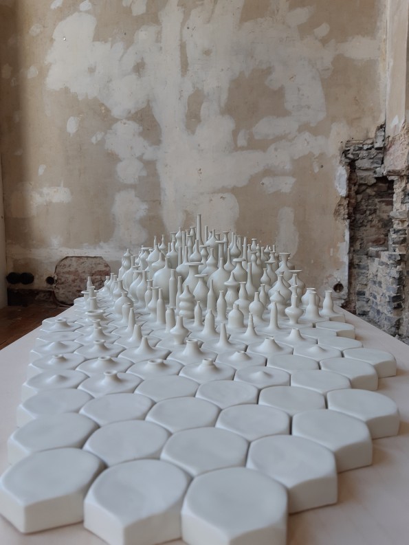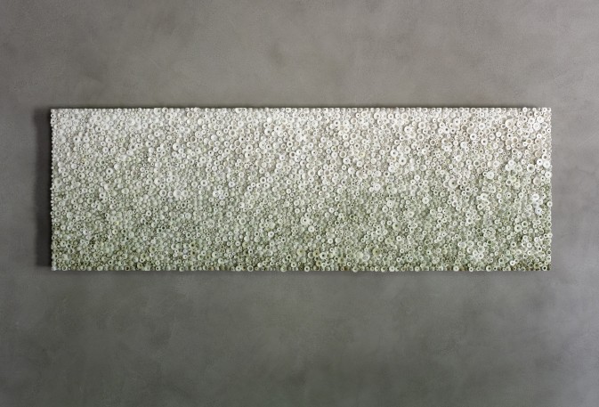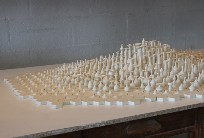 Ses œuvres sont recouvertes de milliers d’amphores miniatures en porcelaine, façonnées une à une à la main, selon la technique du tournage en céramique. Les pièces prennent vie individuellement, déclinées en formes aux lignes harmonieuses, et s’organisent pour composer des œuvres de grande dimension. Car Grégoire Scalabre aime jouer avec les échelles, évoquant la nature dans ses contrastes : l’infiniment petit et l’infiniment grand, l’ordre et le désordre.