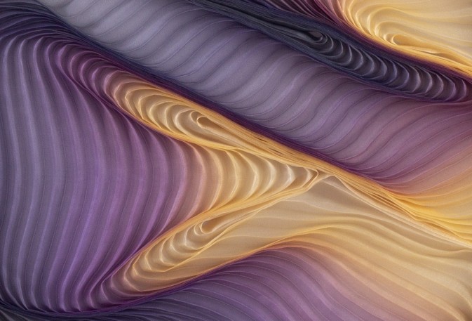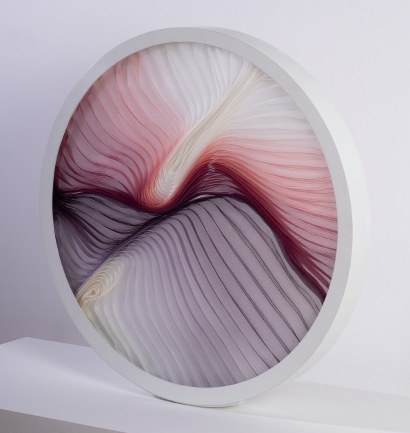 pour l’ennoblissement d’exception et la couleur végétale. Japonaise vivant en France depuis 14 ans, Harumi Sugiura explore les techniques de pliages japonais et de plissage occidental. Son travail se construit à partir de surfaces textiles en deux dimensions auxquelles elle donne volume et mouvement.